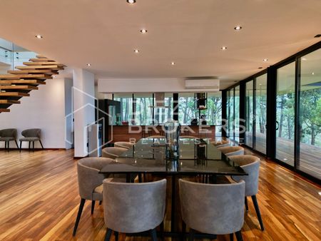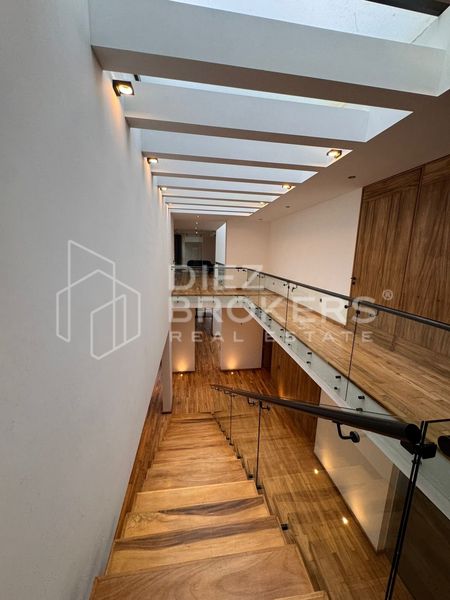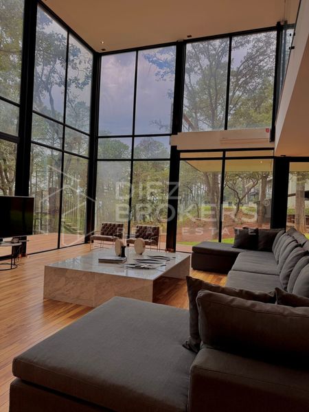 En el interior, dispone de una cocina equipada, sala con doble altura, lo que brinda amplitud e iluminación natural, sala de juegos múltiples, área de servicio, bodega y sistema de climatización. Estos espacios están distribuidos de forma práctica, permitiendo el uso tanto residencial como recreativo.