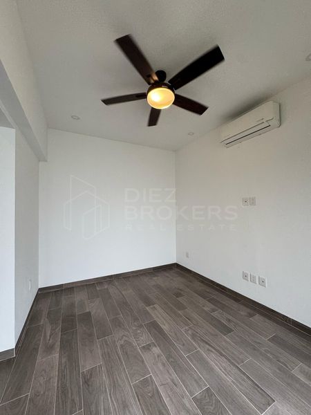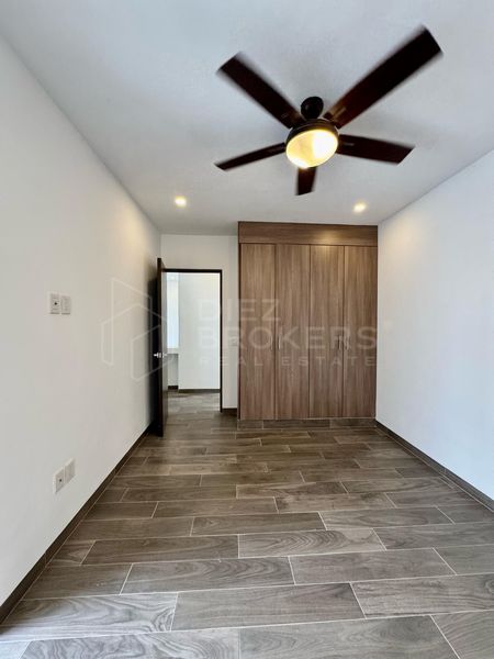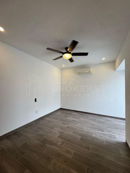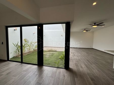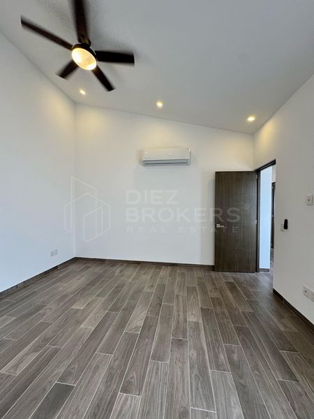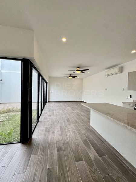 La casa cuenta con 3 recamaras, la principal con walking closet, todas las habitaciones tienen aire acondicionado y ventiladores. Destaca su área social por tener un ventanal con vista al jardín desde la sala y comedor.
