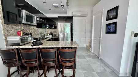 Al entrar, encontrarás una cocina integral completamente equipada, un cuarto de lavado y un amplio espacio de sala-comedor, que incluye dos sofá camas, perfectos para recibir visitas. La terraza, equipada con mesas y asador, cuenta con un ventanal que se abre completamente, creando una conexión agradable entre el interior y el exterior, además de brindar vistas panorámicas al mar. También dispone de un medio baño con lavadora y secadora integradas.