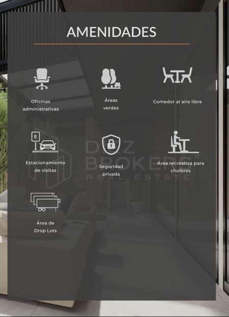 El desarrollo va a contar con Caseta de ingreso para brindar una mayor seguridad, Business Center, áreas verdes, área recreativa para choferes, comedor, área de drop lots y estacionamiento para visitas.